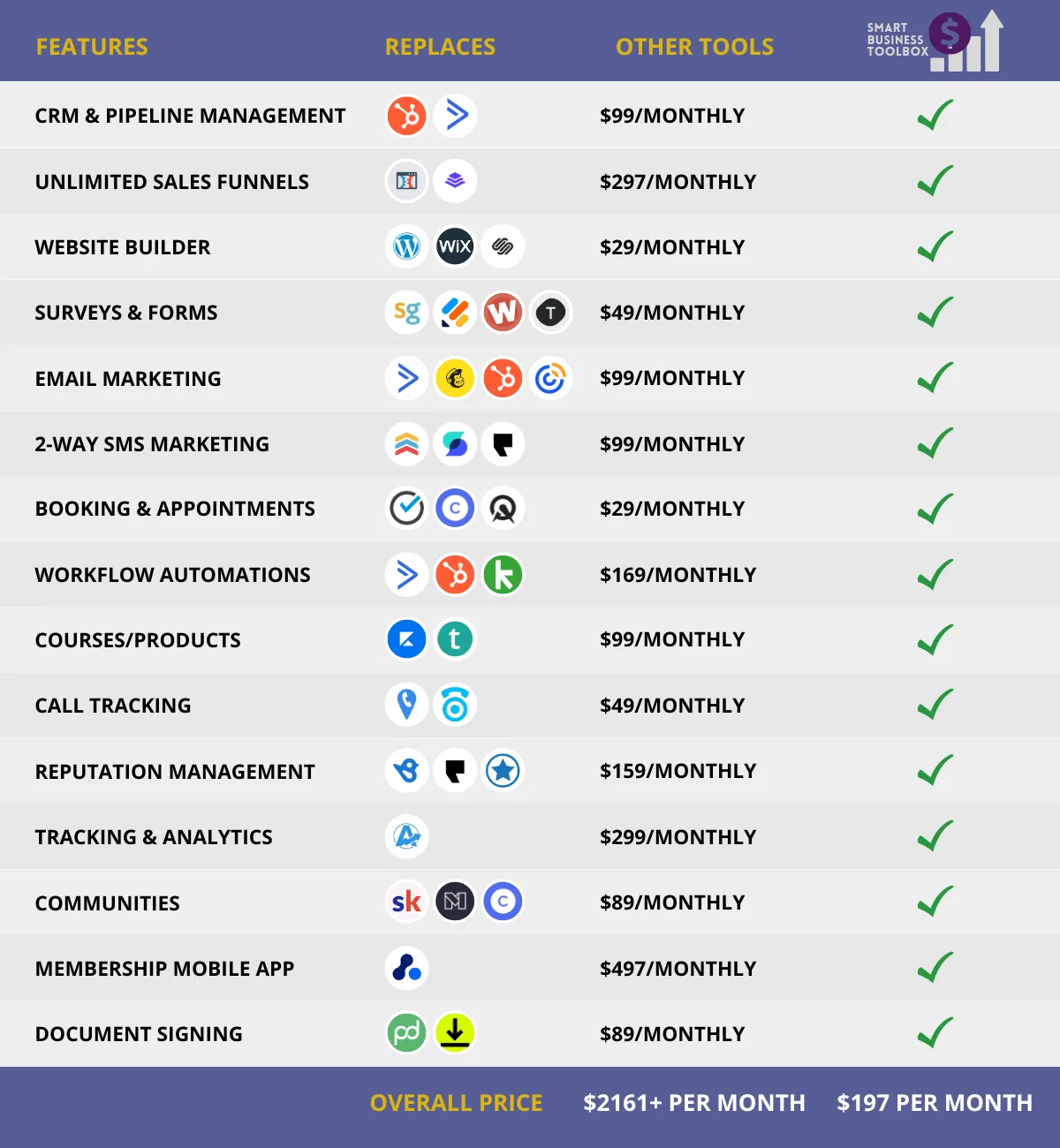 By consolidating premium services into one comprehensive package, Smart Business Toolbox offers an unparalleled advantage. Imagine the expense of independently managing: